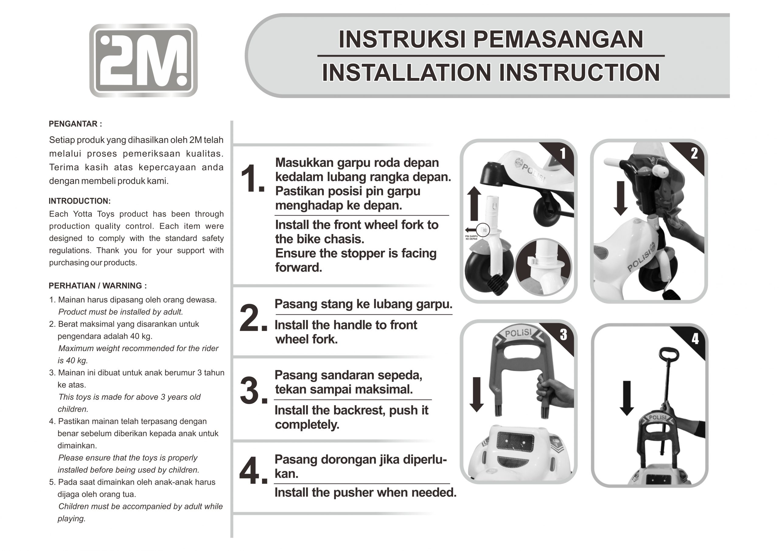 Sepeda Polisi is a children’s toy with a tricycle model. Sepeda Polisi have pedals that the child can ride. There is a push handle that can be used by parents to push or monitor the direction of the sepeda polisi when playing.